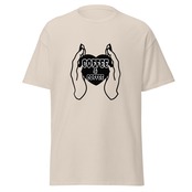 やさしく両手で包み込まれたハートのグラフィックが胸元にプリントされた、印象的な一枚。