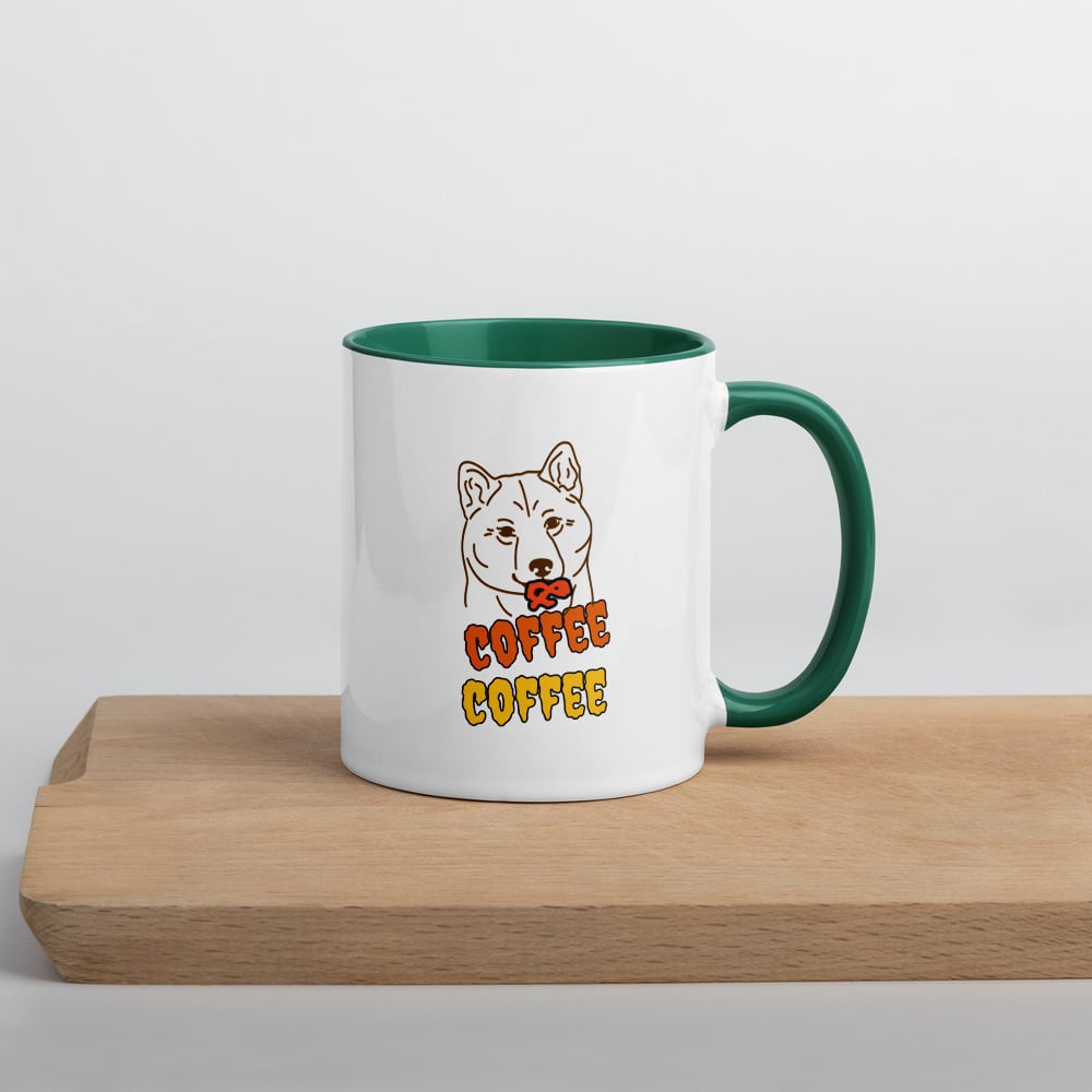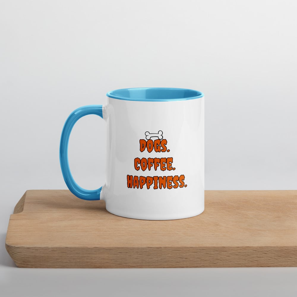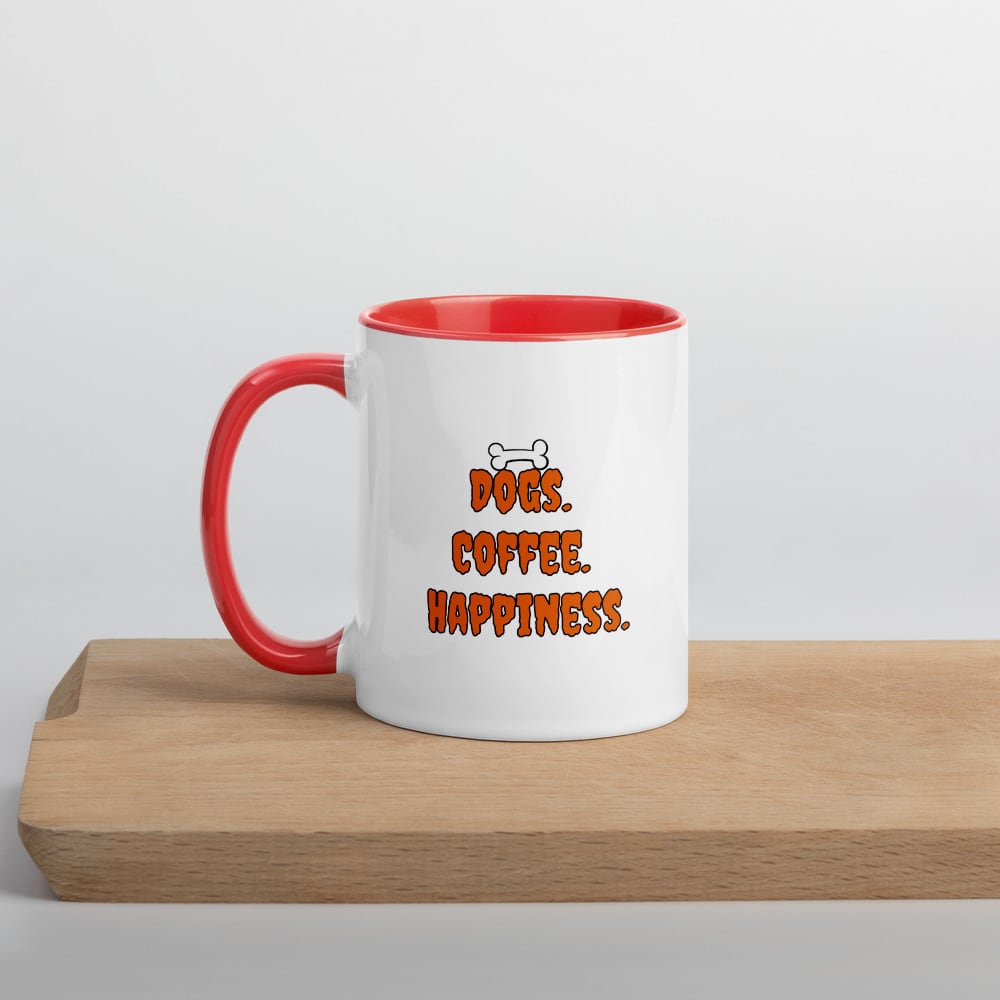 "Dogs. Coffee. Happiness." をテーマに描いた、ゆるくも愛らしい犬モチーフのマグカップです。